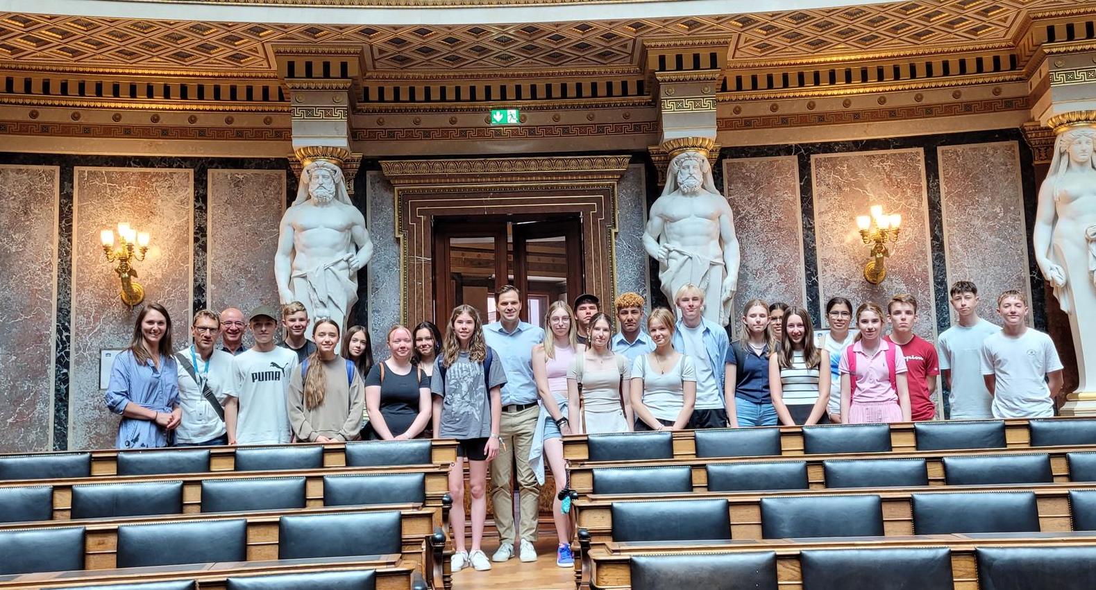 Im Rahmen einer fachkundigen Führung durch das historische Gebäude besuchten die Schülerinnen und Schüler die Sitzungssäle von Nationalrat und Bundesrat sowie den ehemaligen Sitzungssaal des Abgeordnetenhauses, der mit seiner eindrucksvollen Architektur und Geschichte bleibende Eindrücke hinterließ.