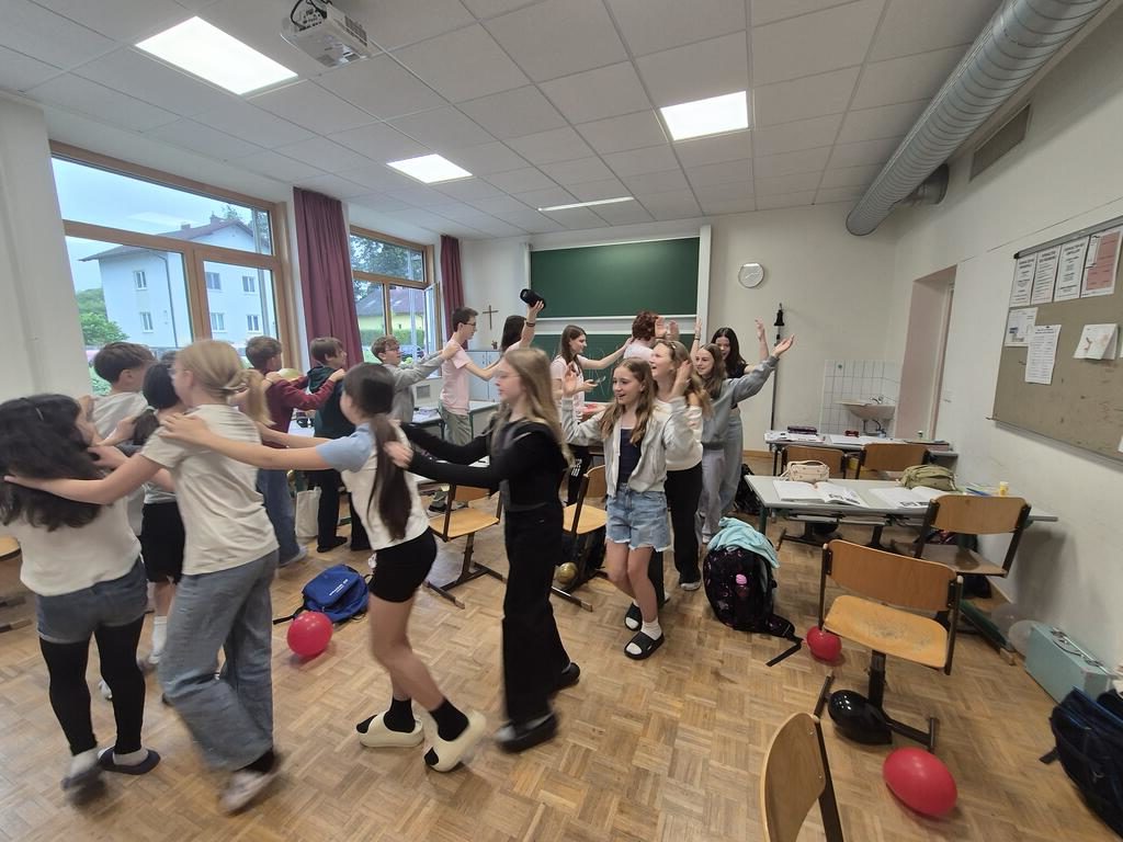Die frisch gebackenen Maturant:innen ĂŒberraschten uns in der Schule Bleibende auch heuer wieder mit diversen Streichen. Es muss hier aber festgehalten werden, dass sie 1. lobenswerterweise ganz trocken waren und 2. die Morgengymnastik durchaus zum Mitmachen animierte.
